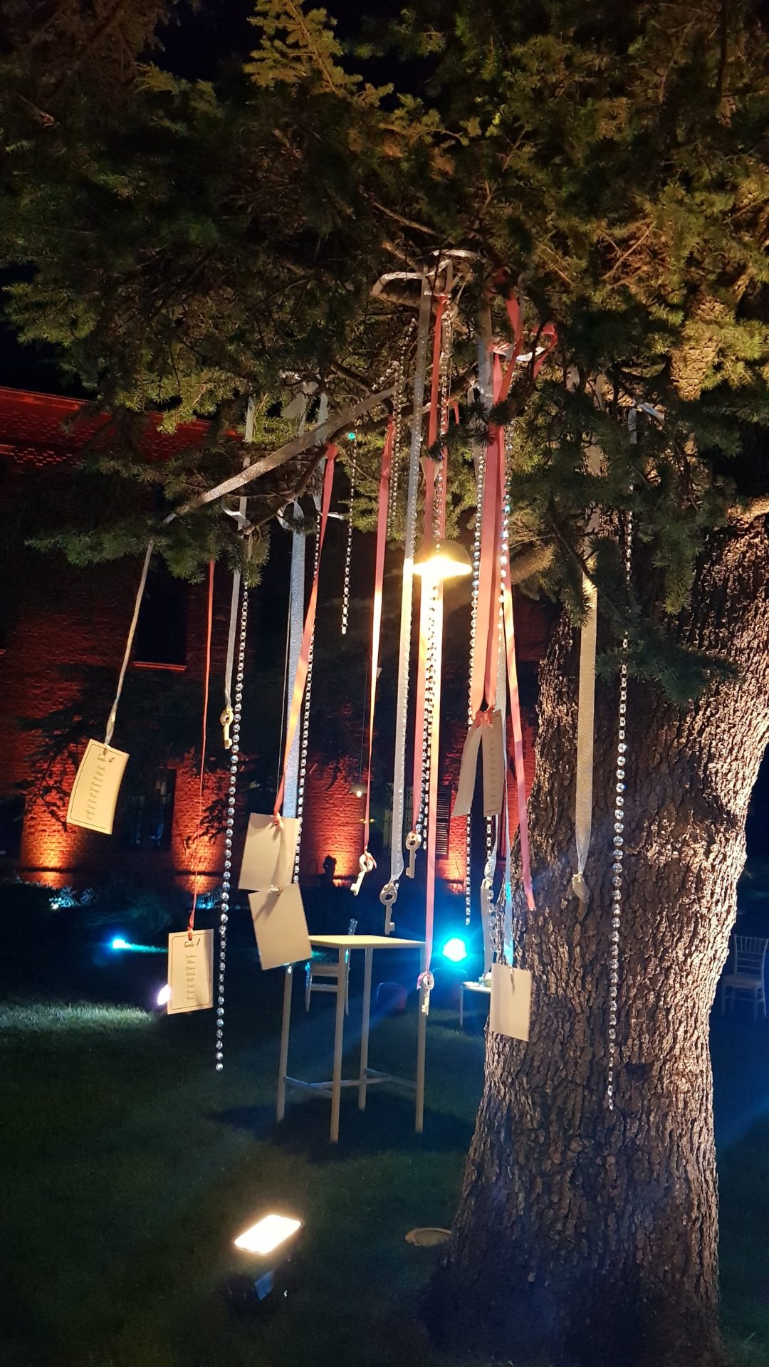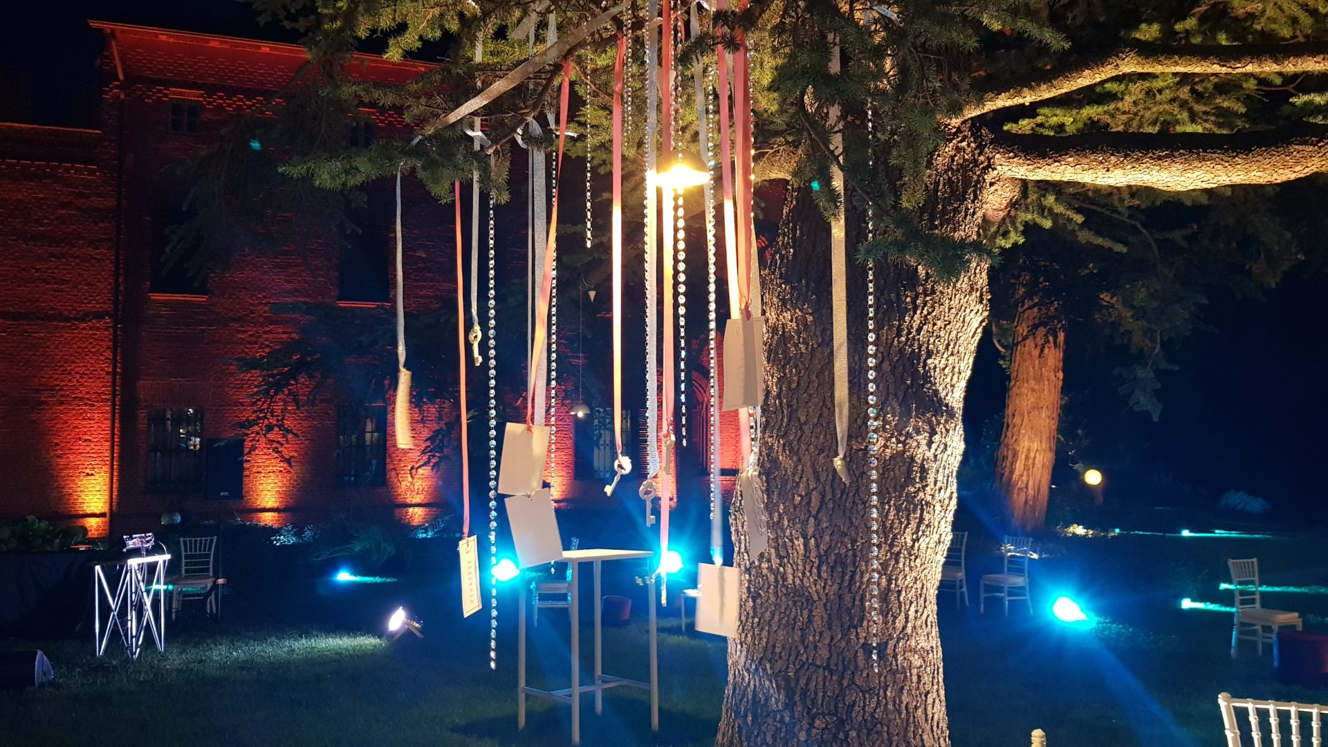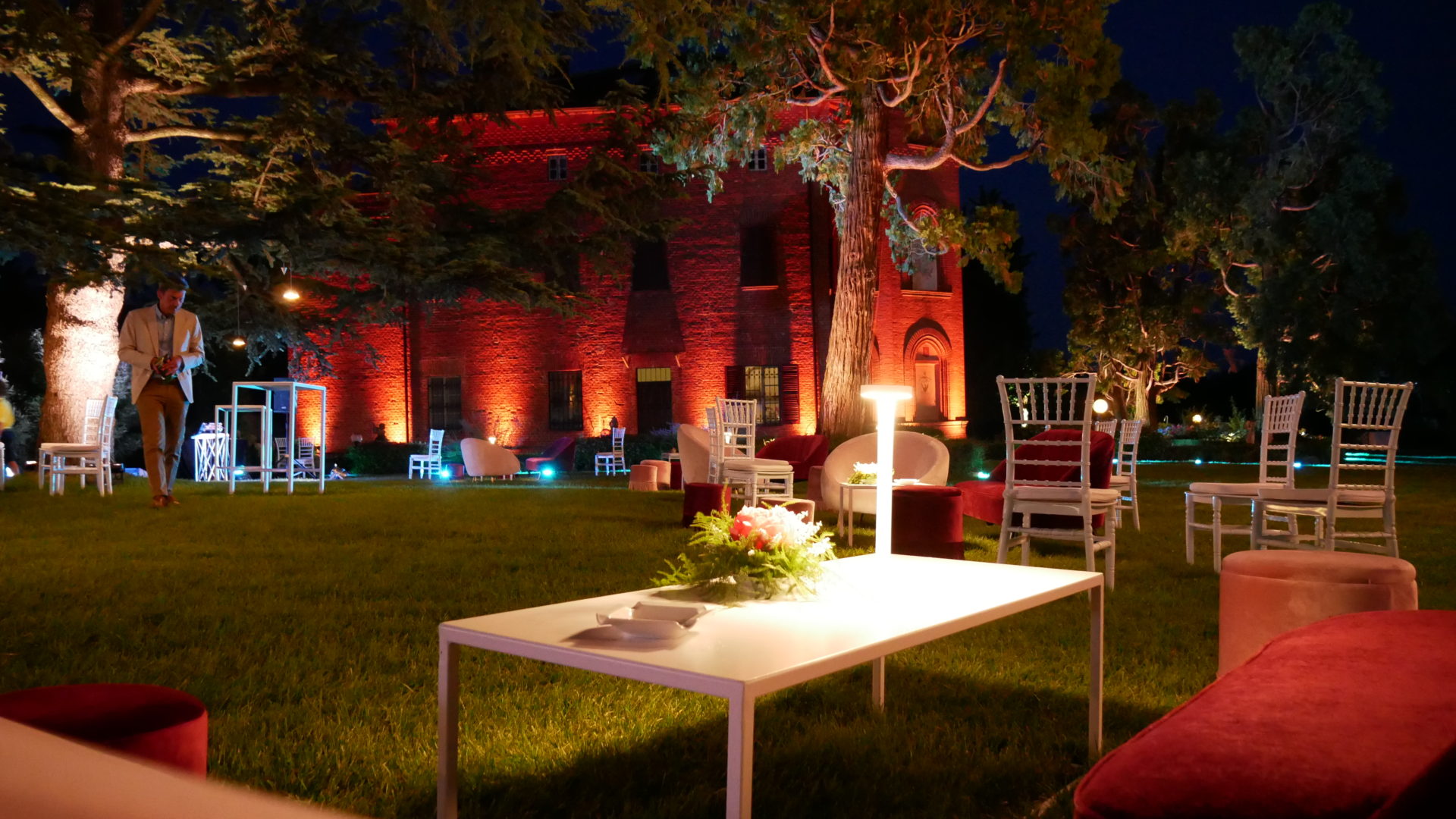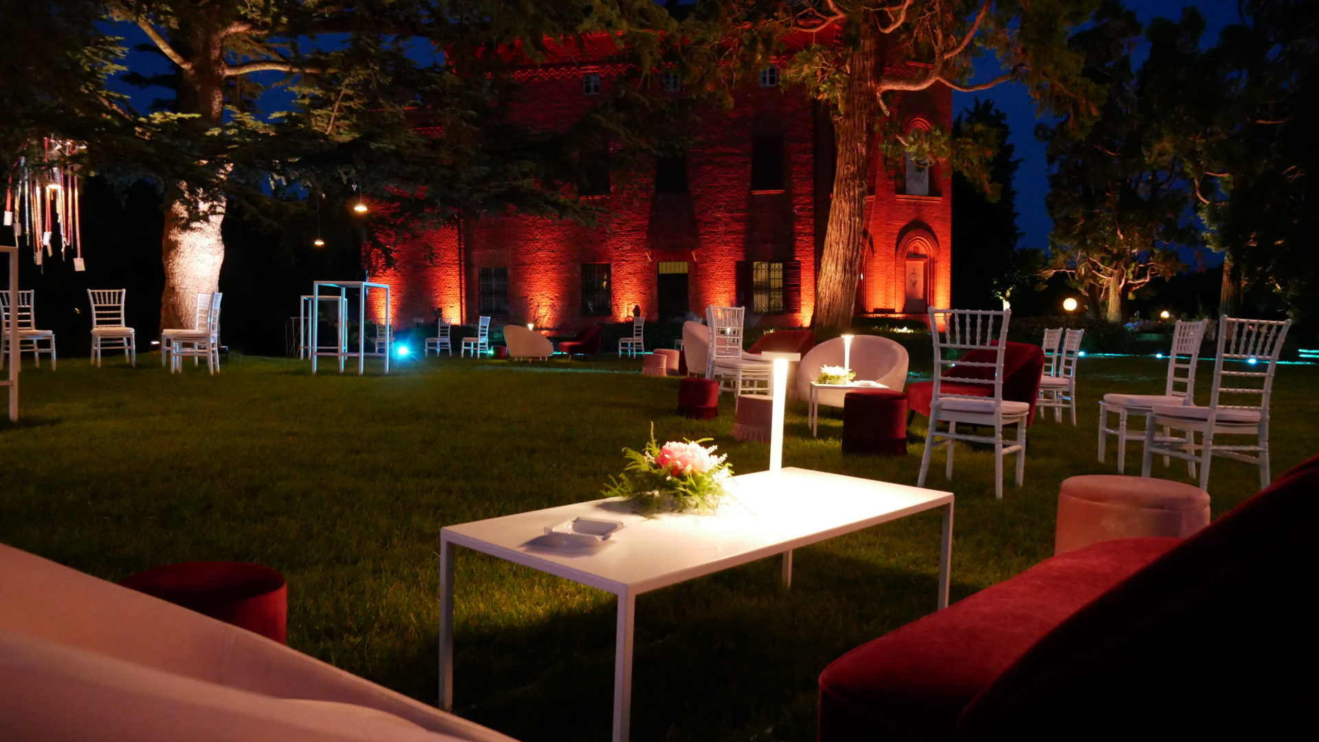 Per creare la giusta atmosfera, abbiamo utilizzato i prodotti della linea Serendipity by Family Studio: diverse tipologie di fari per l’illuminazione del castello e del parco, Tecno Par 2 e centrotavola Tetatet per i buffet e centrotavola Piombo a sospensione, nella loro versione bianca, per creare dei punti luce tra le fronde degli alberi.