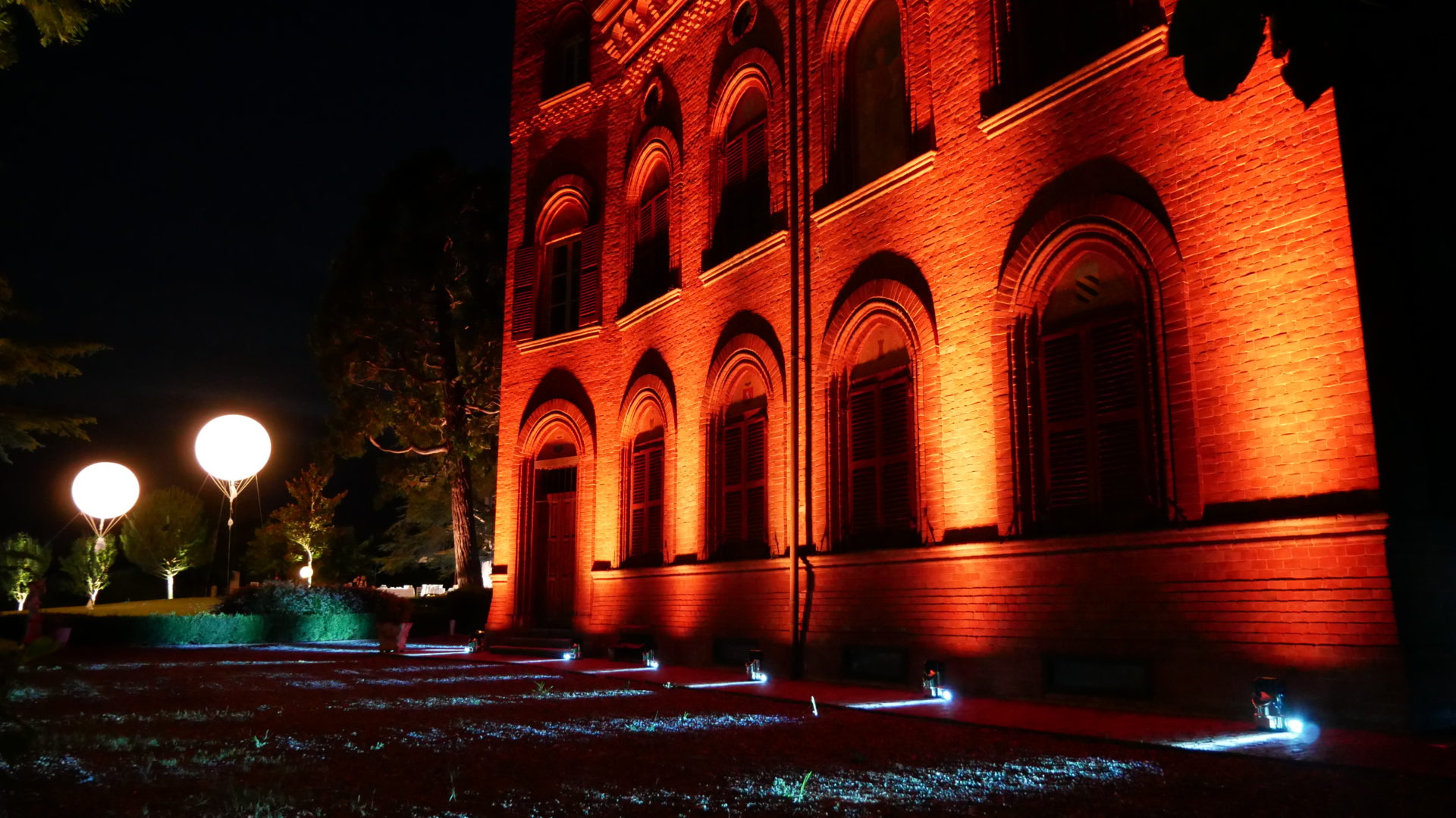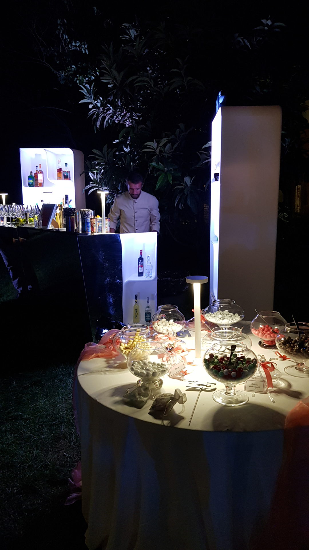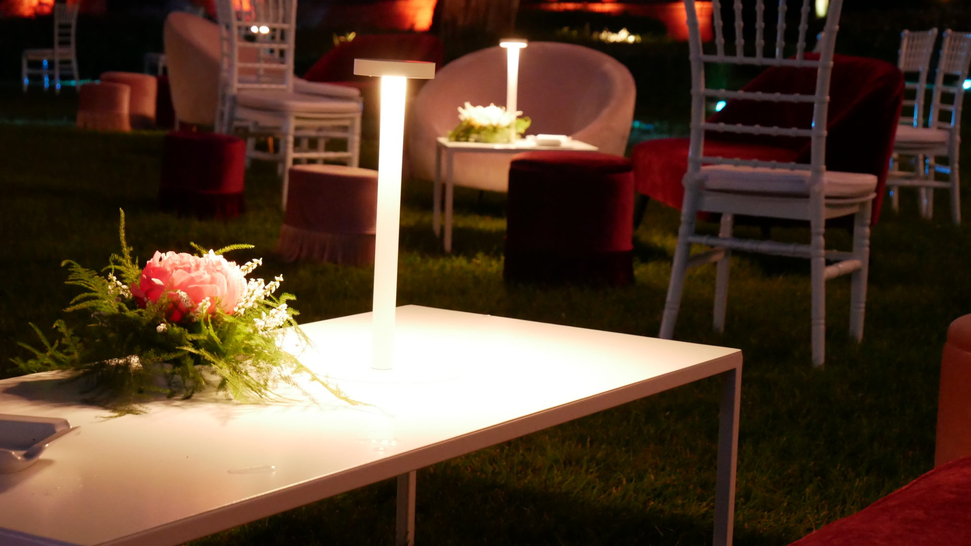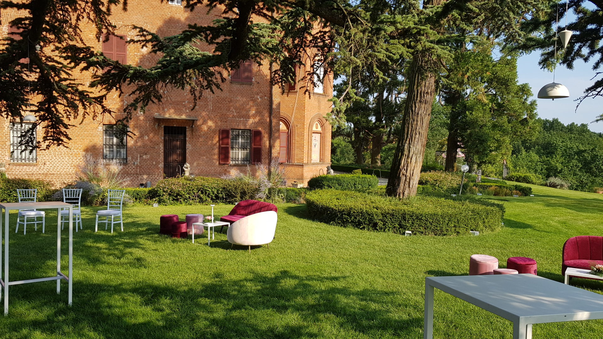 Per creare la giusta atmosfera, abbiamo utilizzato i prodotti della linea Serendipity by Family Studio: diverse tipologie di fari per l’illuminazione del castello e del parco, Tecno Par 2 e centrotavola Tetatet per i buffet e centrotavola Piombo a sospensione, nella loro versione bianca, per creare dei punti luce tra le fronde degli alberi.