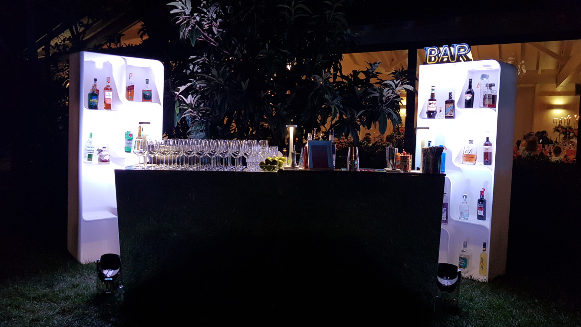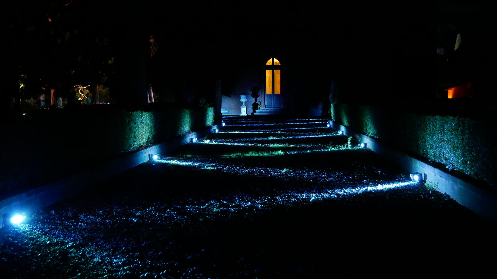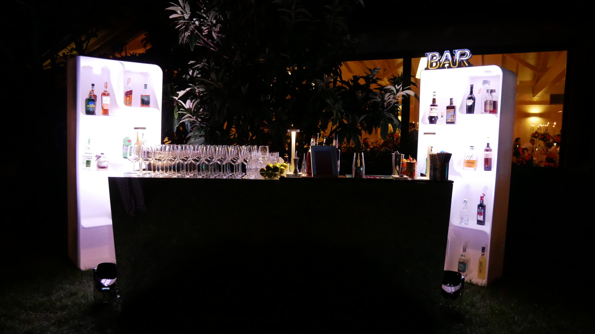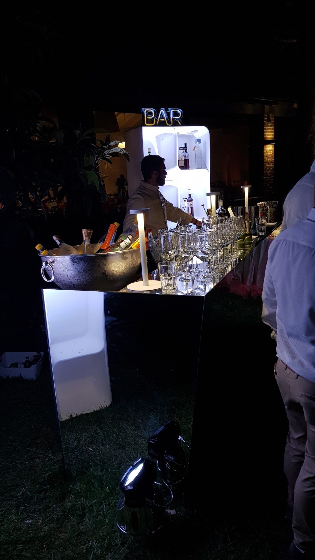 Per creare la giusta atmosfera, abbiamo utilizzato i prodotti della linea Serendipity by Family Studio: diverse tipologie di fari per l’illuminazione del castello e del parco, Tecno Par 2 e centrotavola Tetatet per i buffet e centrotavola Piombo a sospensione, nella loro versione bianca, per creare dei punti luce tra le fronde degli alberi.